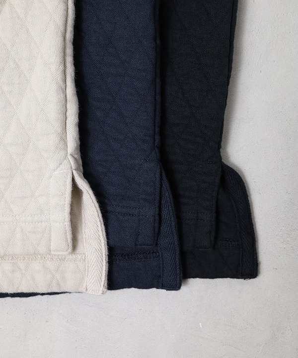 コットン100%の生地を二枚重ねて、そのあいだに薄手の中綿を挟み込んでいます。(品質表示は綿89%、ポリエステル11%となりますが、肌に触れる生地は綿100%になります)