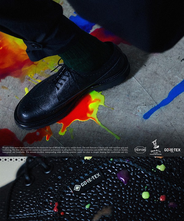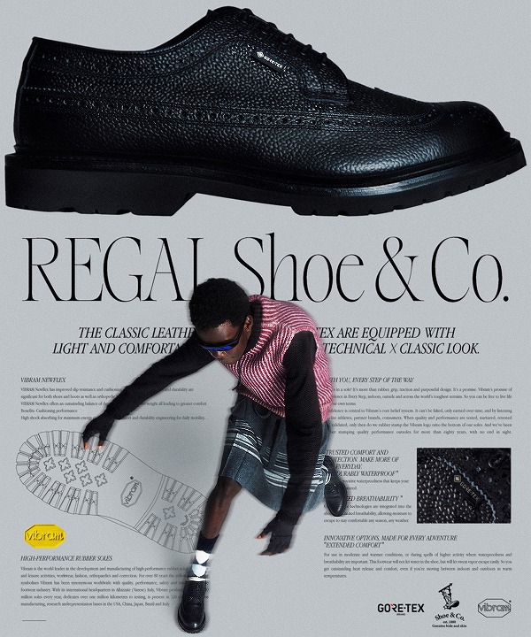 軍靴製造をルーツに持ち、タフで壊れにくいグッドイヤーウエルト式製法を 日本に持ち込んだリーガル。 その本格的なレザーシューズは60年代のアイビールックブームを経て、日本のスタンダードとなった。 そのルーツをもう一度体験し、スニーカーカルチャーの中で育った世代にも レザーシューズにこだわりを持つ世代にも、リーガルが持つ歴史と品質、 そしてデザイン性に触れてもらいたい。 その思いから「REGAL Shoe & Co.」は誕生した。