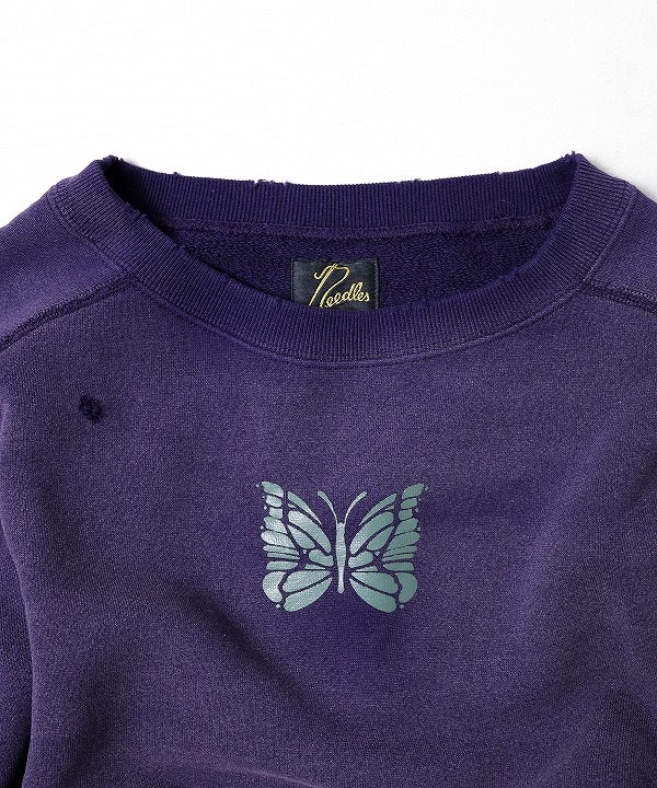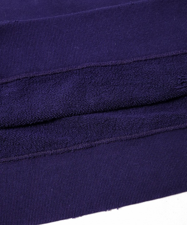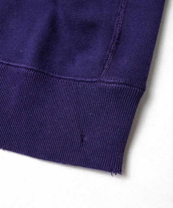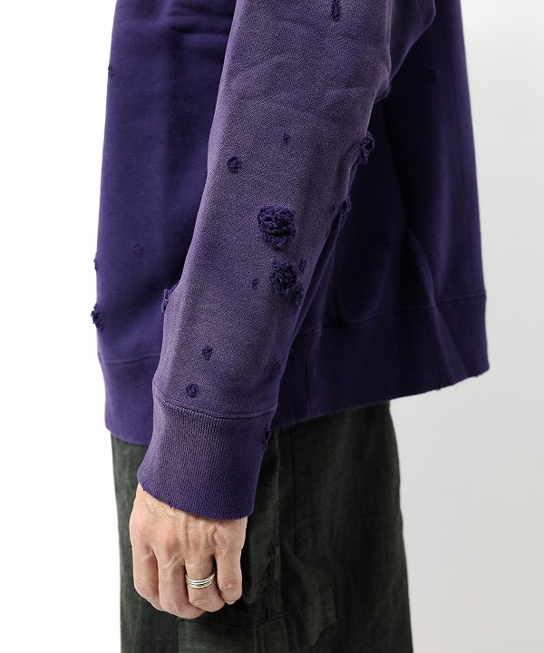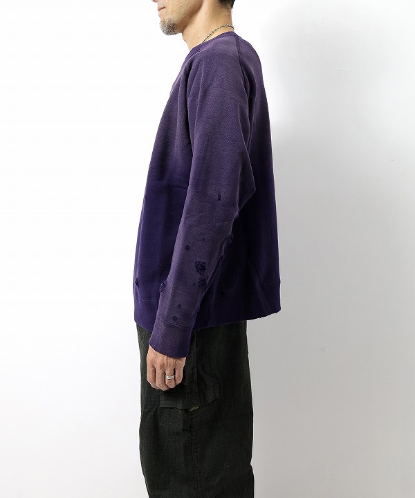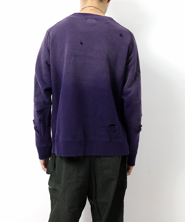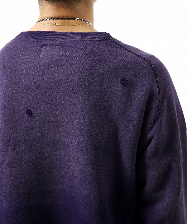 ヴィンテージスウェットのようなリアルなダメージや色褪せの加工が施されたスウェットシャツ。