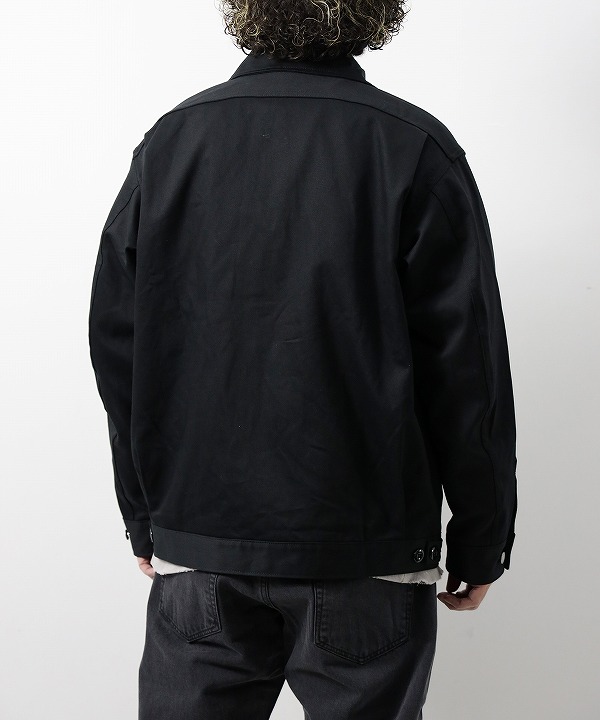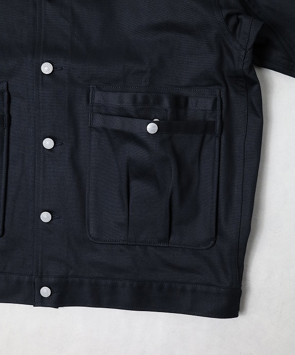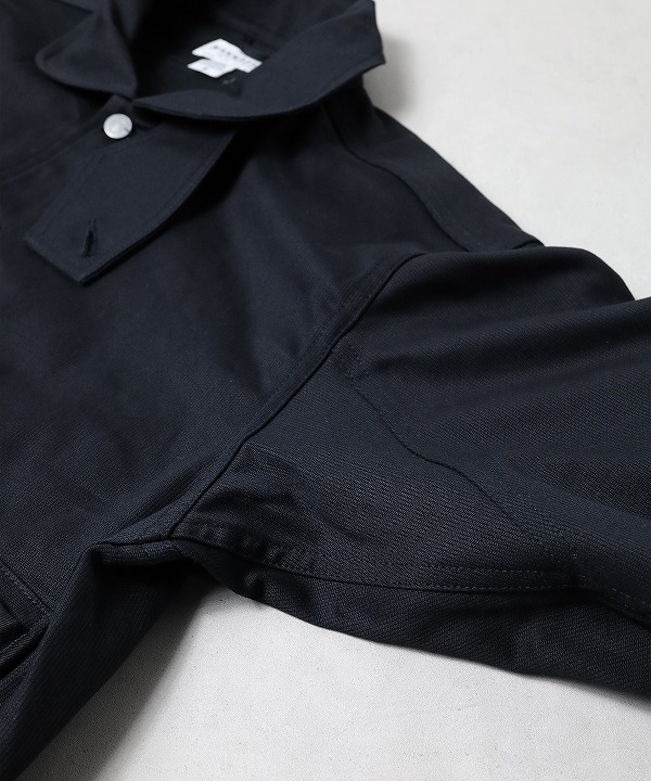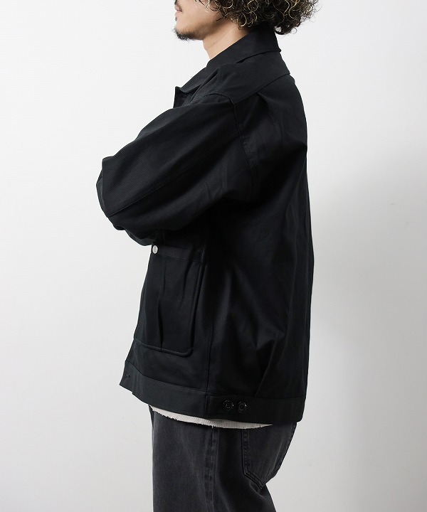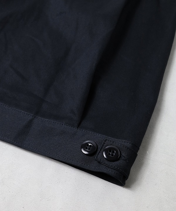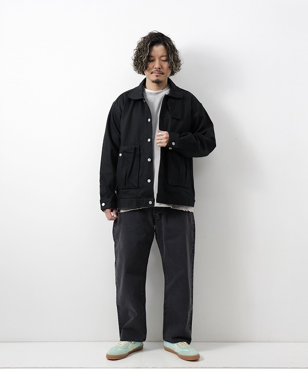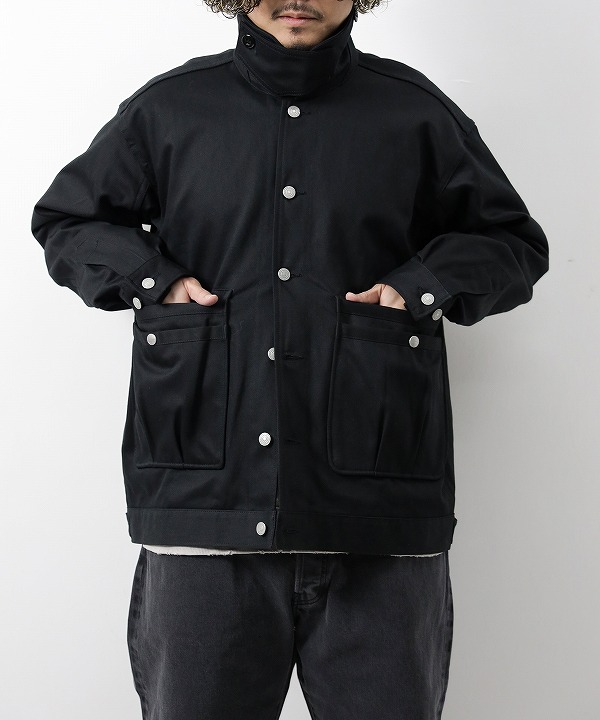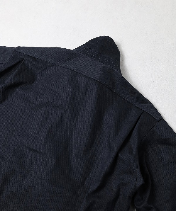 すっきりとした印象の着丈に程よくゆったりとしたボックス型のシルエット。ササフラスのトラッカー型に採用されているボタンを使用し、Gジャンのような雰囲気も持った取り入れやすいバランス感。