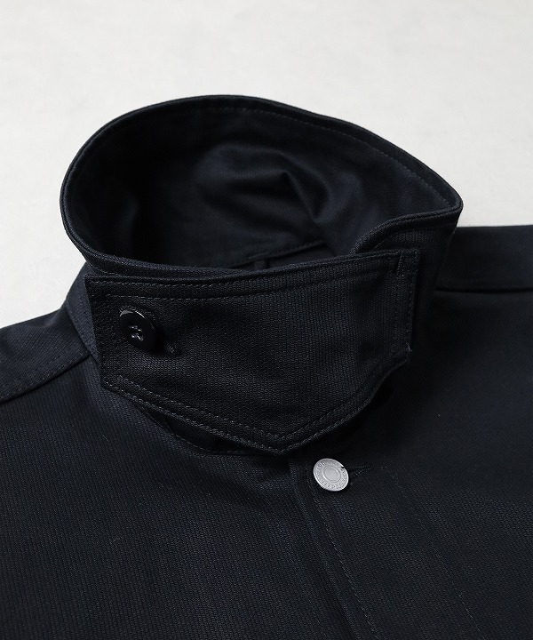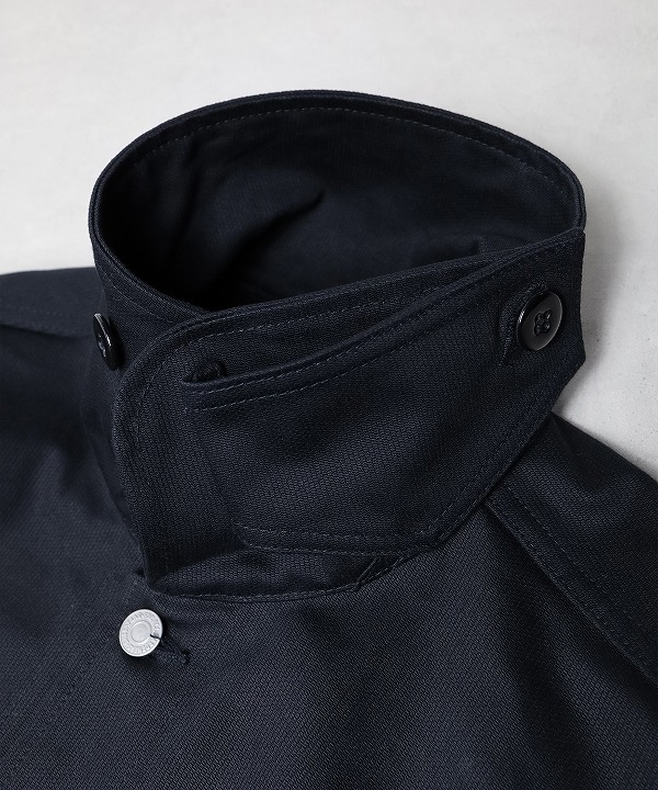 脇下にはガセット、襟もとにチンストラップが付きスタンドカラーとしてもアレンジ可能。