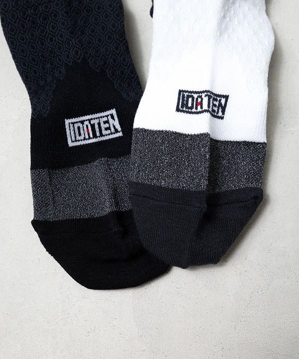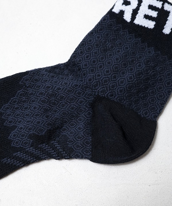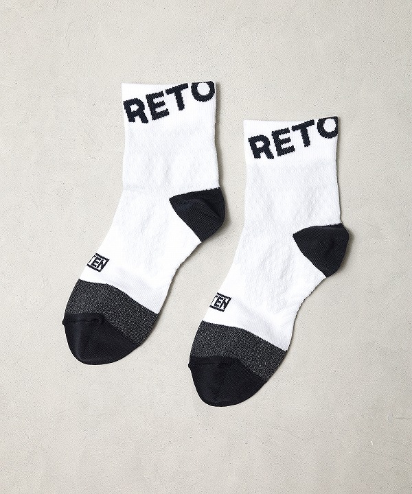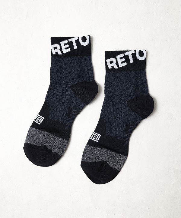 RETOプロダクトの代名詞となっている、IDATEN別注のコンプレッションミッドカットソックス。神野大地こだわりの”鍛えられた脚がカッコよく見える”エリートランナーが好むくるぶし丈は、かかとの靴擦れを防止しつつ、吸汗による重みも最低限に抑えます。ブランドロゴが大きく入った、可愛さも光るソックスです。