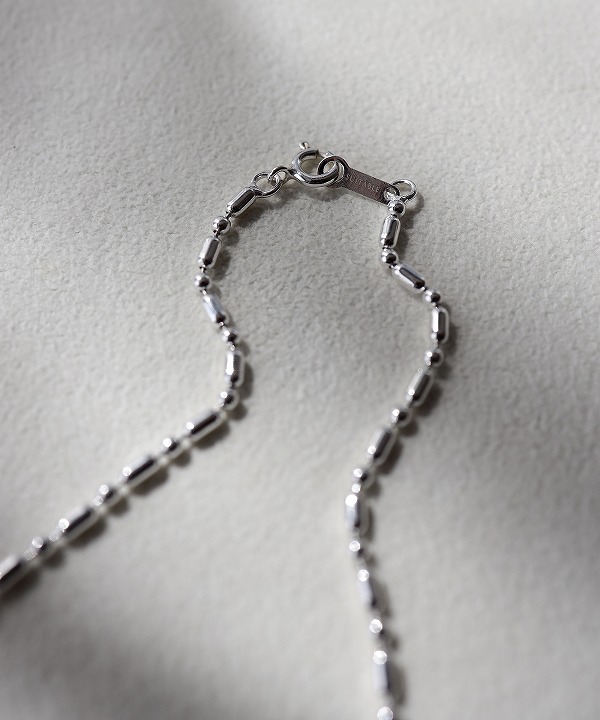 滑らかなバレル(樽型)パーツと、小さなボールパーツがリズミカルに配置されており、光を受けるたびに表情豊かな輝きを放ちます。