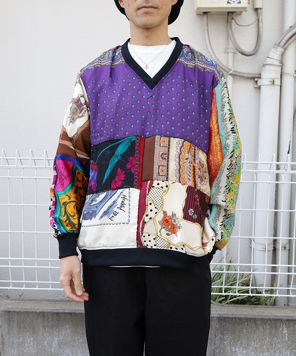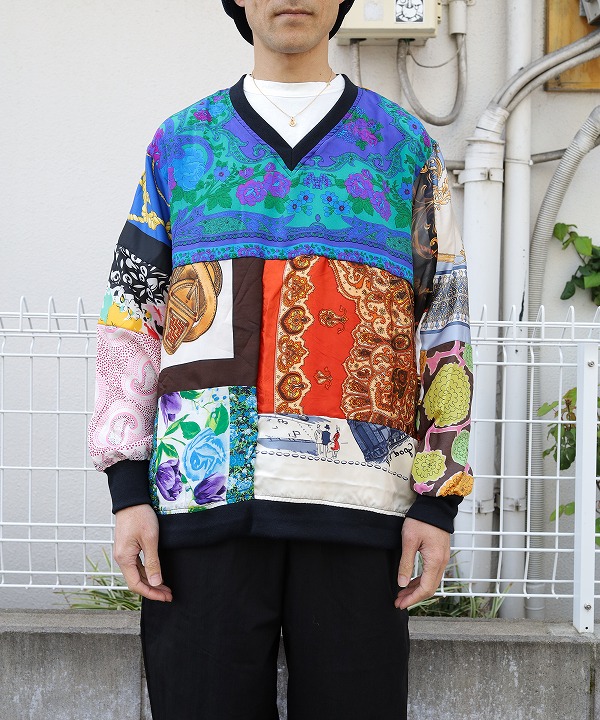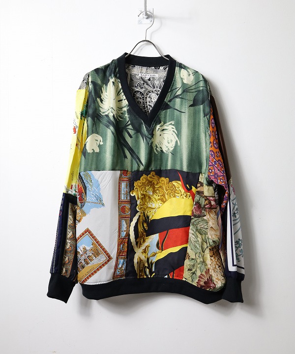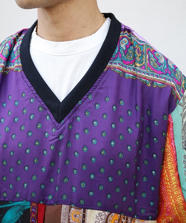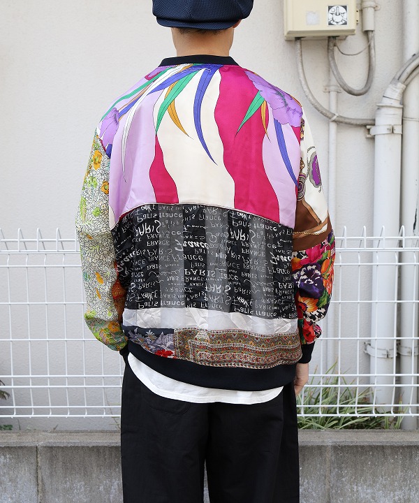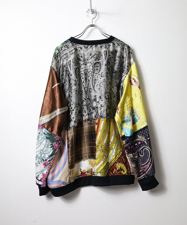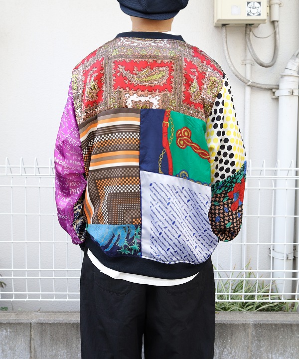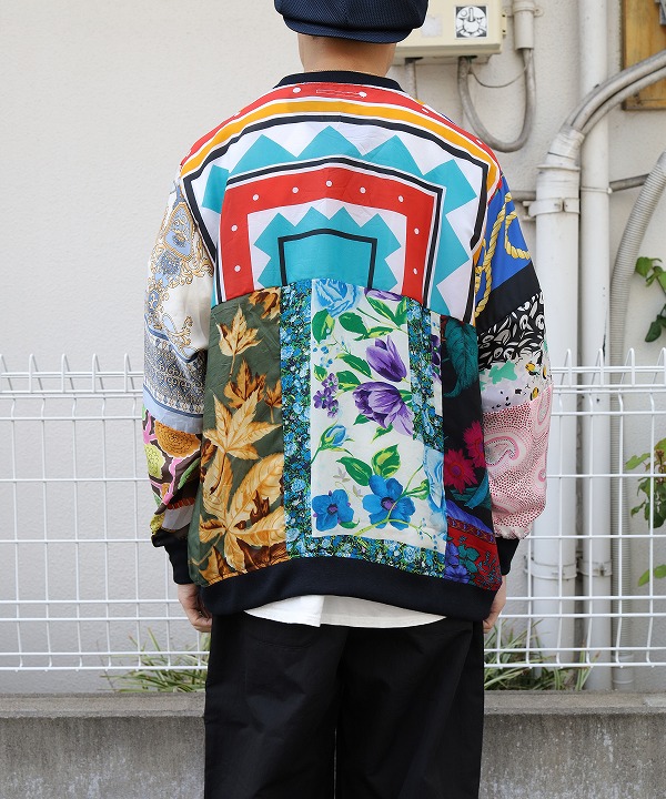 様々な柄が組み合わさった独創的なデザインでポリエステル素材ならではの艶感をまとっています。