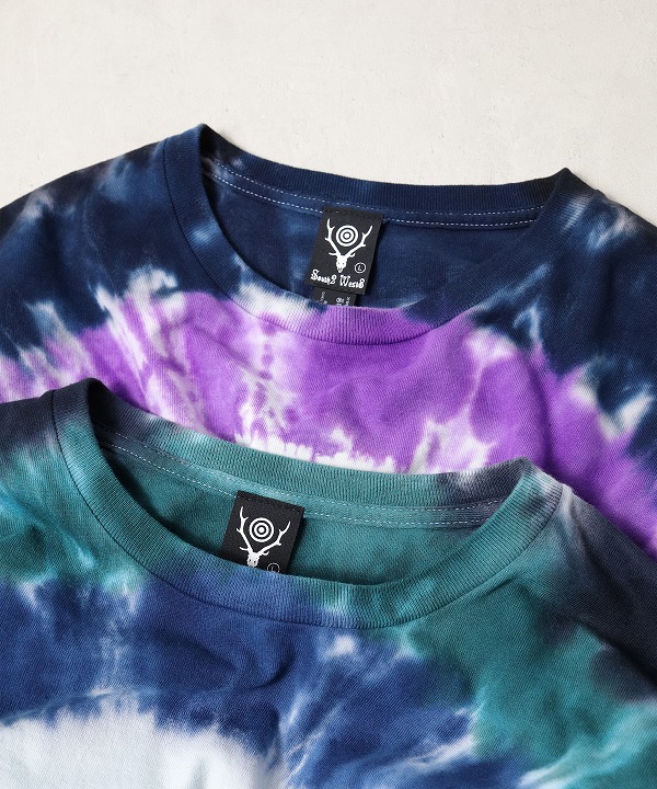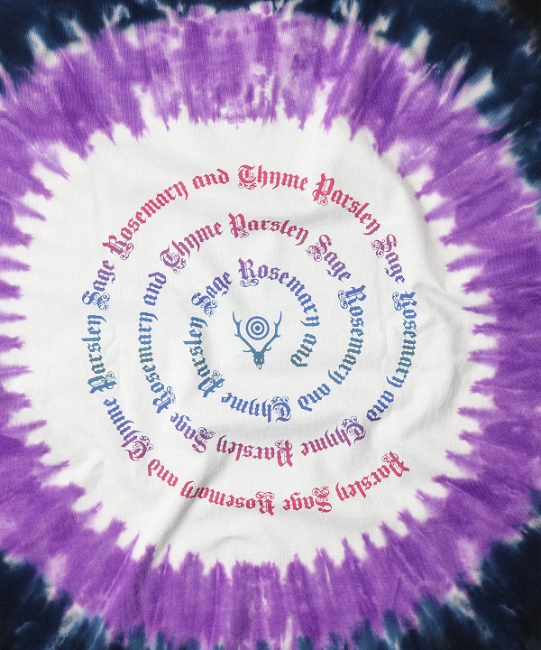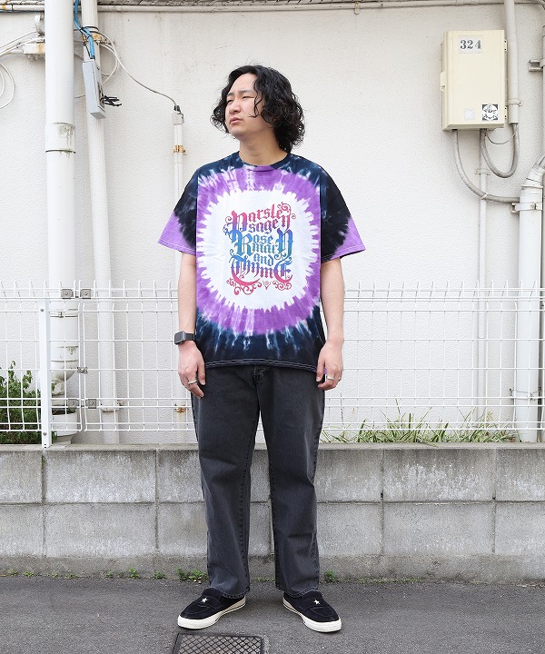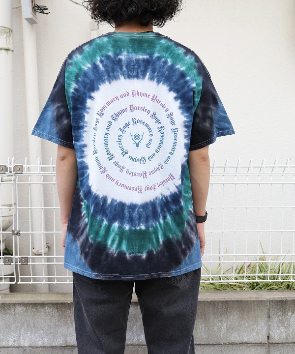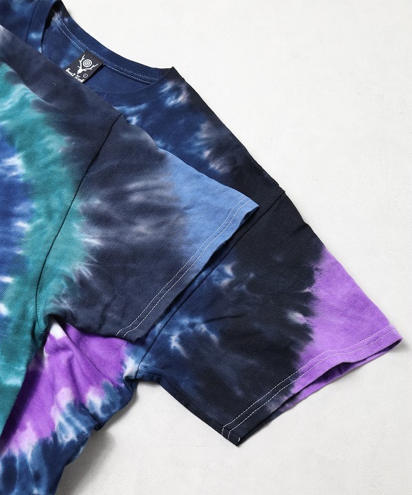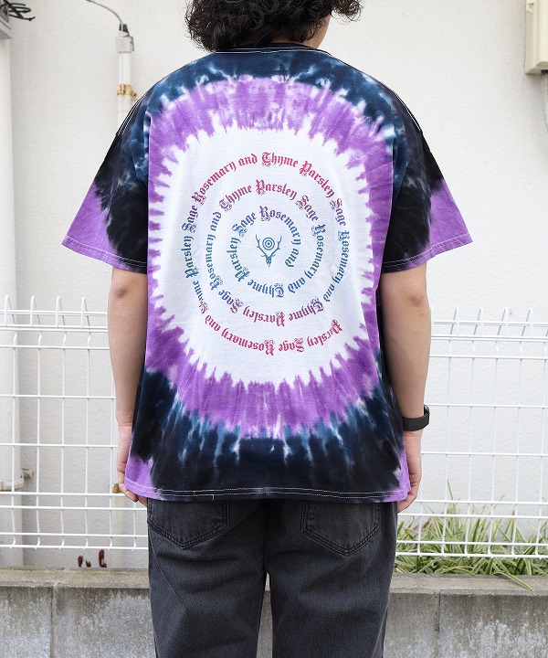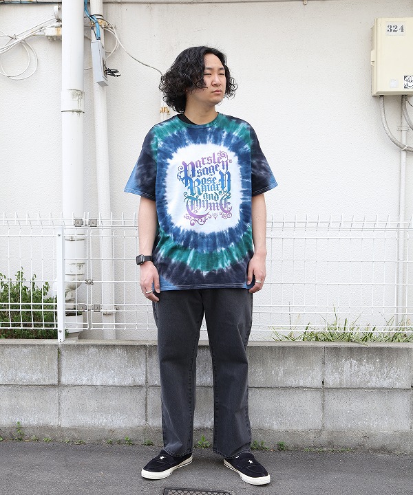 鮮やかなタイダイの総柄プリントが目を引くショートスリーブTシャツ。