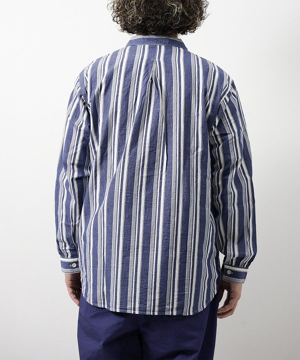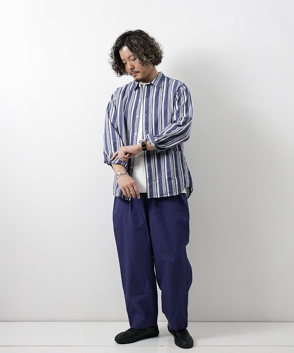 小ぶりの襟や脇に流し込まれたパッチポケットなどアウター代わりとしても使えるシャツです。後ろ見頃はインボックスプリーツにする事で腕の可動域を広げるとともに、デザイン的にも抜け感のある表情に仕上げました。