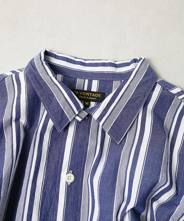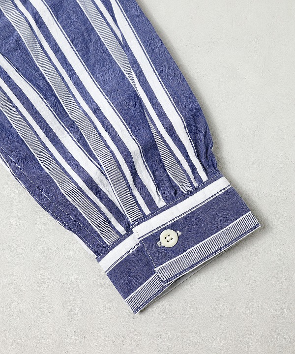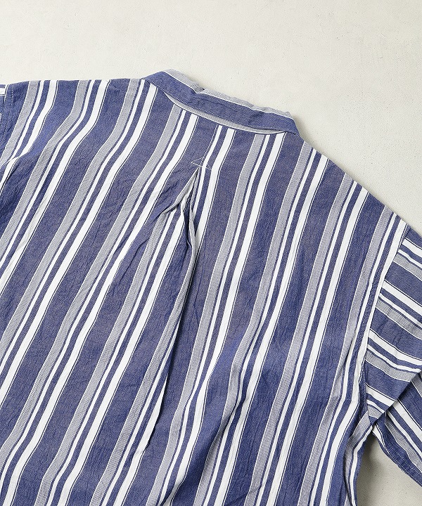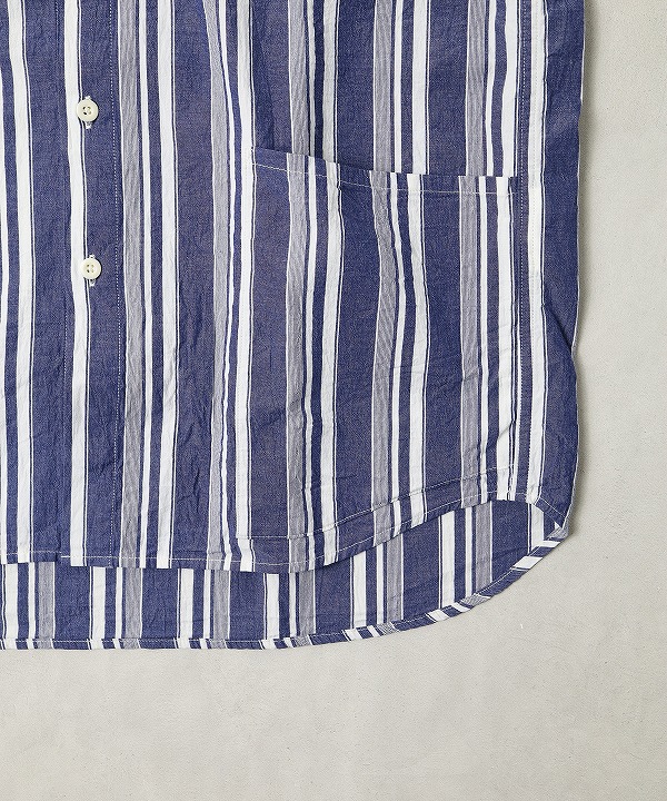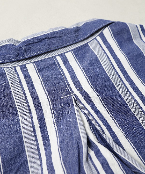 生地は経糸、緯糸ともに強撚したオーガニックコットンを使用したストライプシャンブレー。