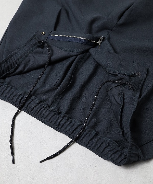 ウエストはゴム+ドローコードの楽チン仕様でループも付くのでシーンによってベルトを取り入れたスタイリングも可能。